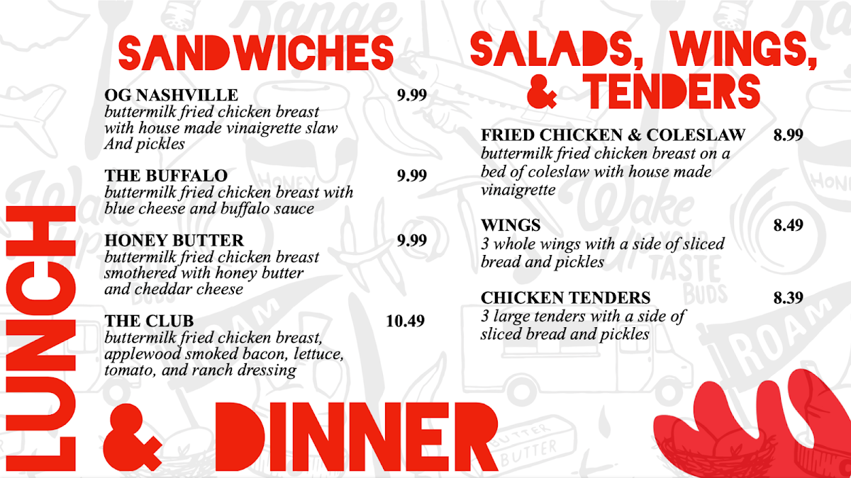 “ Both the honey butter sando and the tenders were good. The “hot” heat level wasn’t too much - if you like spicy foods, try it. The breading was on the lighter side. Overall ”